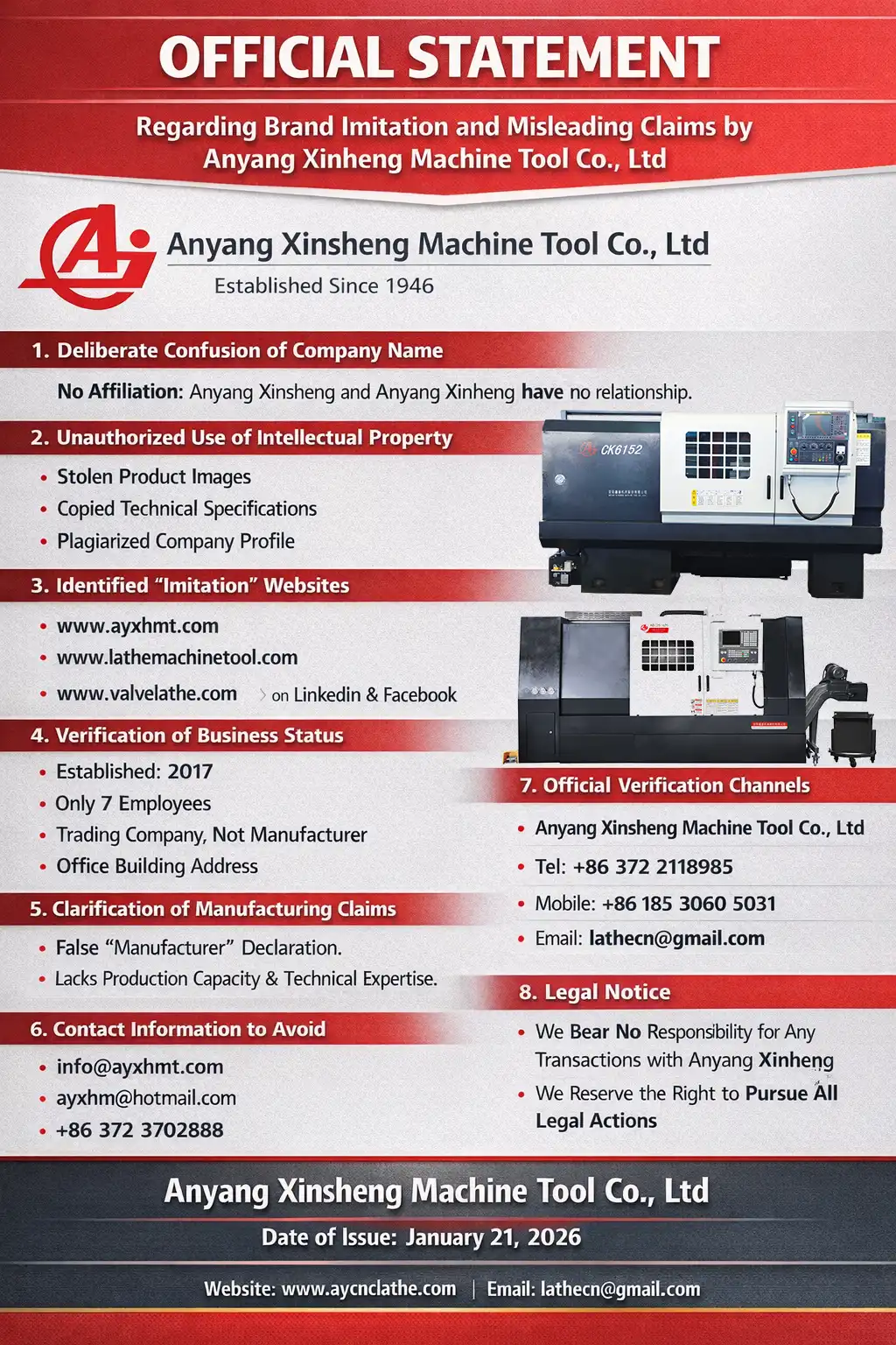 Any inquiries, transactions, or cooperation conducted through Anyang Xinheng Machine Tool Co. Ltd, its websites, or its social media accounts are entirely unrelated to our company.